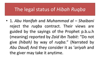However the issues on the status of the terms of umra and ruqba have become a dispute between the fuqaha. The application of hibah umra and ruqba are valid as the underlying ground for the survivorship principle of joint tenancy contract which would facilitate housing for the Muslim couples being compliant with shariah rules and regulations. KONSEP UMRA DAN RUQBA UMRA Pemberian semasa tempoh hayat penerima faedah hibah dengan syarat harta tersebut dipulangkan kepada pemberi Hibah SELEPAS kematian penerima hibah.